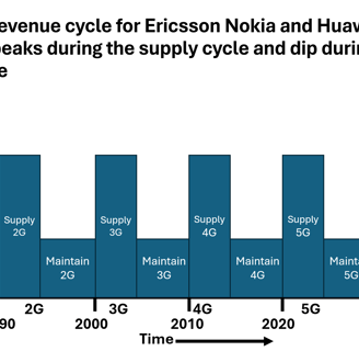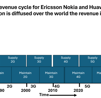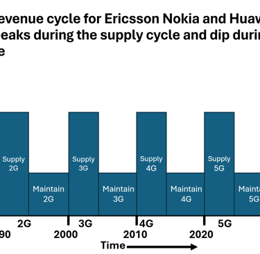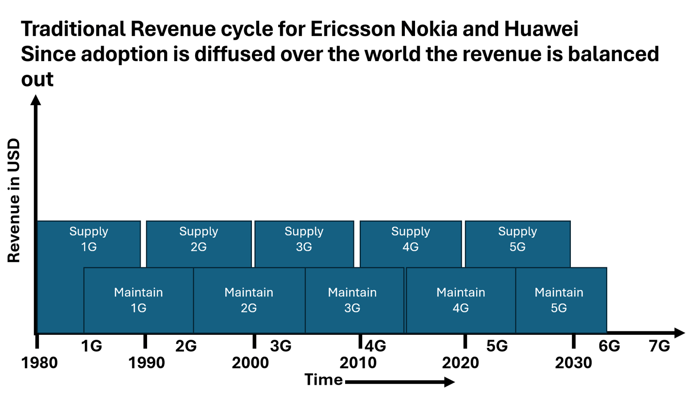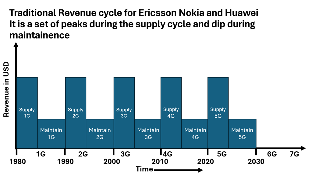 What we see from the diagram below is that the existing players Ericsson Nokia and Huawei work on a traditional supply and maintain model where the revenue is good during the supply part and dips during the maintain part.