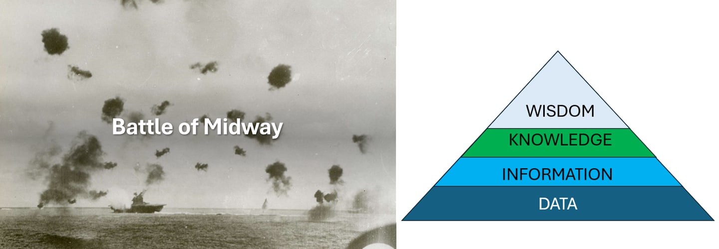 The Battle of Midway during WWII was a turning point in the Pacific, Admiral Nimitz led the U.S. fleet, while Admiral Isoroku Yamamoto commanded the Japanese. It was also a battle of data information. The key to America’s victory was intelligence: The U.S. cryptographers had broken Japan’s code (JN25B) and intercepted plans to attack a location called “AF.” Unsure of what “AF” meant, the U.S. base at Midway sent a fake message about a water shortage because of a failed desalination plant on Midway Island . They made sure the Japanese got this information. After Japan had got this information, in their internal communications Japanese military communicated with one another that AF had a water shortage problem. They did not mention that Midway had a water shortage problem. By referring to an island which had water problems as AF, They confirmed to the US forces that AF referred to Midway. With this knowledge, the U.S. could always understand when they planned to invade AF and they prepared a counterattack when the Japanese attacked AF and ambushed the Japanese fleet, and won decisively by sinking the entire Japanese fleet. This gave US a totally open sea route to advance towards Japan. Japan had no carriers that could attack American naval vessels. This is a classic case of turning data into information, knowledge, and wisdom (DIKW). AF was just Data, what AF meant was knowledge and when they intercepted that the Japanese were going to attack AF they had transitioned from the data about AF into information and knowledge and wisdom of what to expect and how they would react to this information.