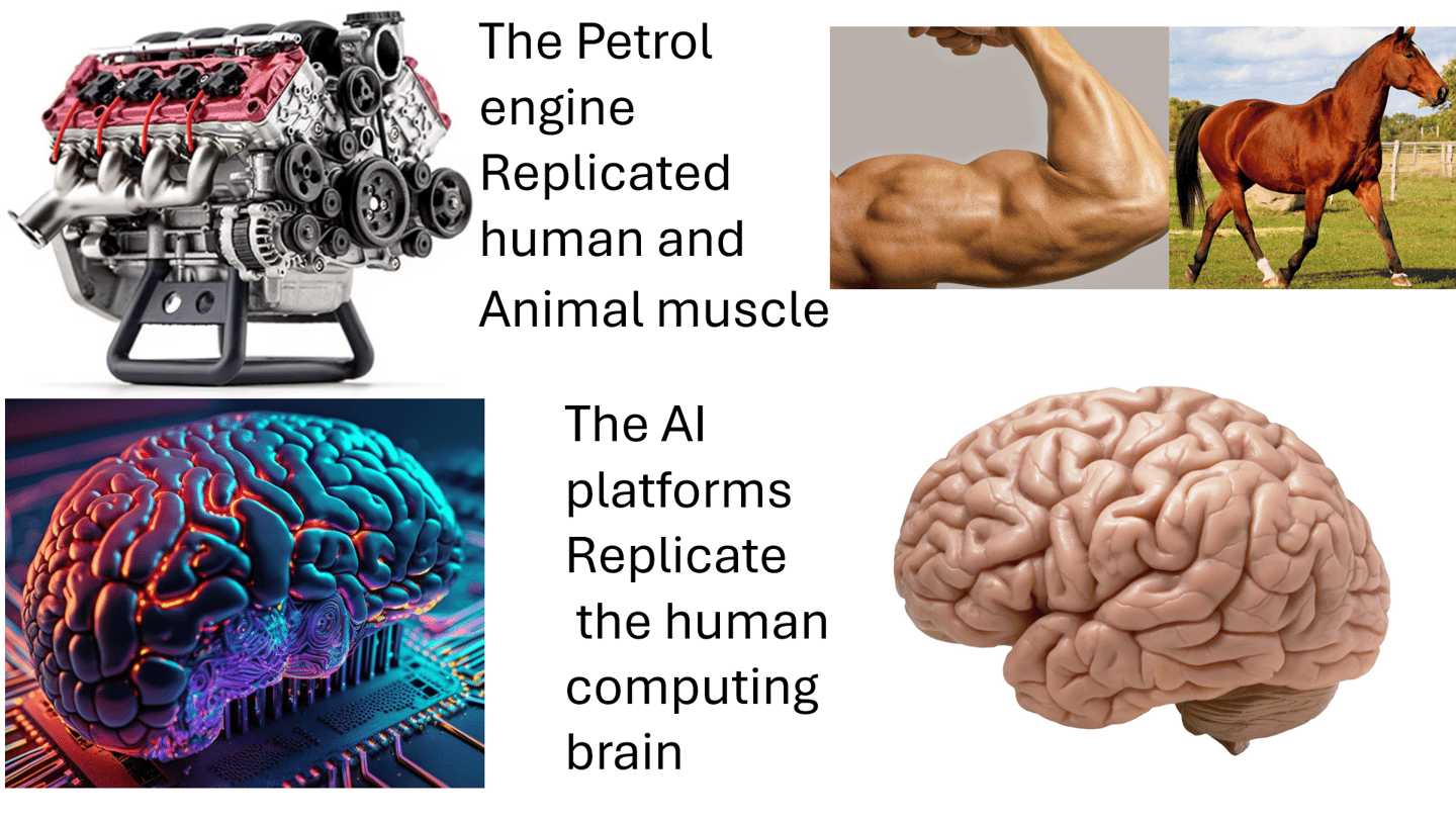 We see all this buzz around AI and how AI is going to replace Human activity and a view that AI will replace all jobs and from a perspective of a value model I see the AI agents as pattern of the petrol engine. And the comparison is valid for a reason of power. When the petrol engine came about, it could power all activities that human muscle and animals did at that point in time. be it as transportation with horse carriages or using horses for running milling machines for grinding grains. Once the petrol engine came about, it started replacing all activities where it could be substituted for muscle power from animals or Humans. AI is similarly going to replace human thinking and execution activities , which can be done by AI. A horse powered grain milling machineThe first cars were essentially a petrol powered horse carriageWhat AI does not possess is the moral map and you will not have Mother Teresa or Mahatma Gandhi AI or Adolf Hitler or Idi Amin AI. AI will be a machine with computational power similar to a petrol engine that generates power when you step on the gas and burn fuel. Except it will be computational cycles in an AI environment. AI as envisioned by experts is going to take away human jobs in many areas which are transactional and follow a process. It can be opening a bank account or doing a job that can be replicated by technology to follow a process. And here is a prognosis of the types of jobs that will be lost and the list is long. Data Entry and Processing : Cashiers etc Data entry clerks and processors are vulnerable to AI automation. Vast amounts of Data can be handled by learning algorithms better than humans.Customer Service Representatives AI powered automation agents can handle routine enquiries like reporting a lost credit card and blocking it or getting a replacement SIM card or opening a bank account. Manufacturing and Assembly Line Workers Robotics and AI have been used in the manufacturing Industry for many number of years and have replaced assembly line workers and this trend will continue.Transportation and Logistics With Autonomous vehicles being the norm soon enough most transportation and logistics jobs will be at risk. Automated vehicles could replace up to 400,000 long-distance truck driving jobs in the US alone. today there are 3.54 million truck drivers employed in the US alone. Retail Salespeople AI and retail sales will replace many of the current retail jobs . With the growth of Darkstores and Automation happening in them. There will be fewer and fewer people required to complete sales. Proof readers and Translators AI has the possibility to analyse huge amounts of data on the fly and these jobs will be replaced by AI Automatons. Market Research and financial Analysts Routine Market research and financial analysis jobs which can be automated will be at risk as AI can handle huge amounts of data efficiently. However in some areas human analysis would remain crucial. Radiologists and Diagnostic Technicians AI is becoming increasingly adept at analyzing medical images. The IBM AI Watson was getting skilled at analysing cancer images of patients and that work will be automated with doctors.Bookkeepers and Accountants AI can automate book keeping and accounting tasks. Deeper insights in accounts will require humans, but the basic accounting jobs will be taken over by AI automatons. Content writers AI tools like ChatGPT help create content which is very readable and catchy. Coders and Graphic designers AI tools like ChatGPT help write syntactically correct code faster and accurately than most humans. Standard if else statement codes can be created by these AI agents faster and economically. Graphic designer jobs could also be replaced by AI Alogorithm patterns being learnt by AI agents just by visiting sites and having machine learning. Coders AI tools can replace low level code writers, where the basic code can be generated with AI tools instead of humans.Customer services This area has many opportunities for AI agents who would learn customer processes and how to service them. There are many examples of AI in customer services like Robotic process automation, customer self services, Chatbots etc. Anywhere where Automation can be done and people who provide services can be reduced is an area of growth for AI. There are also sentiment analysis engines that give a direction to the help a customer wants from the service agent. Legal space This area has many opportunities in the legal space for document review, contract analysis, case law search, legal research etc. Marketing AI can automate marketing related material generation like data analysis, prospect segmentation, social media analysis sending emails etc. Travel and tourism AI can help travelers discover new destinations and book flights vehicles for transportation and hotels.Army and air and naval forces More and more mechanical AI automatons will be used as soldiers and air and naval men, running tanks, Planes and ships towards enemy targets for destruction. In the recent wars in Ukraine and Russia, Israel and Palestine and India and Pakistan, we find that a lot of drones were being used. So where do we see a role for human to work. In critical areas like thinking with moral maps and societies which focus on human development will be the areas where the humans will contribute, All other areas where human process can be automated based on a established response framework, AI and automatons will be used. and this brings us to the concept of Virtual Ownership. As we discussed during our earlier part 2 or this series on the battle of midway, the value of data generated will give us not just information, but also knowledge and perhaps generate wisdom looking at the Patterns generated by the data of all devices. And now we come to the question of how do we manage the tons of data being generated by all the devices we have. and the next question is how do we enable the interexchange of data to get new 