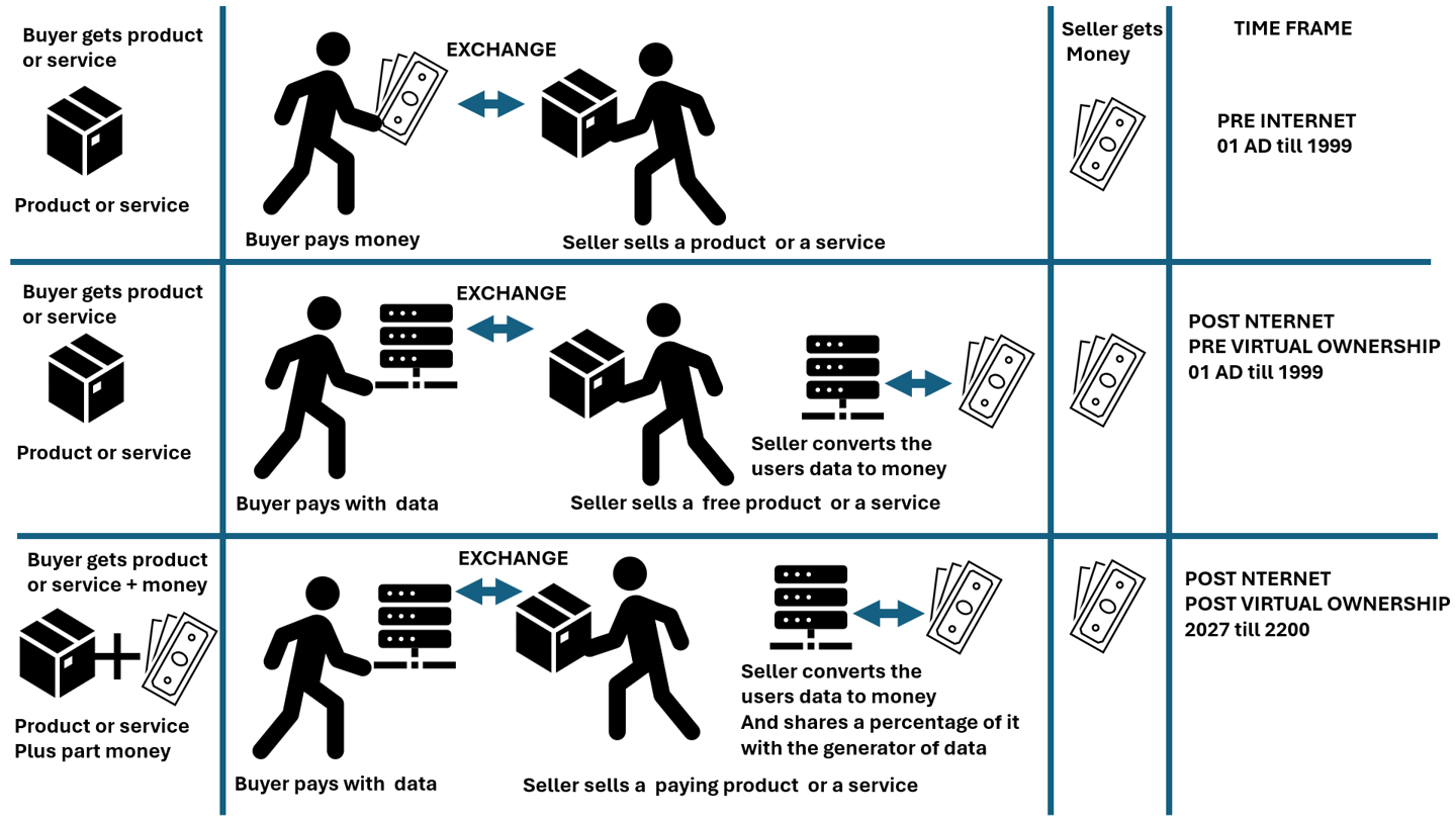 The figure below illustrates three key trends in the Internet’s evolution, mirroring human trade. Web 1.0 tried physical payment models, but they didn’t suit services like search or social media. This led to the freemium era, where users paid with data. Now, with AI, we’re entering a third phase—data ownership and revenue sharing, where users may earn from the value their data generates, marking the rise of virtual ownership. Chat GPT and similar AI search functions will not succeed without a paying VBE model.