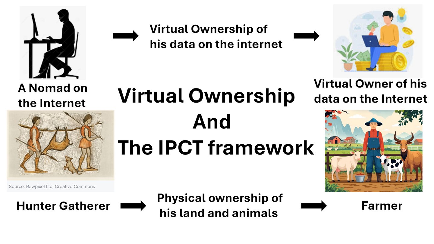 History of Human development and future Internet development with Virtual Ownership.Winston Churchill once said, “The longer you look back, the farther you can see forward.” Reflecting on this while reading Sapiens by Yuval Noah Harari, I was struck by the shift of human society from hunter-gatherers to farmers and how it introduced the concept of ownership. Unlike animals, early humans began claiming land, crops, and relationships as their own. This idea of ownership became the foundation for societies, family structures, and eventually nations. Farming required permanence, which reshaped our behavior and mindset, marking a key turning point in human evolution. This is the first part of the series which introduces the concept of Virtual Ownership and the IPCT framework.