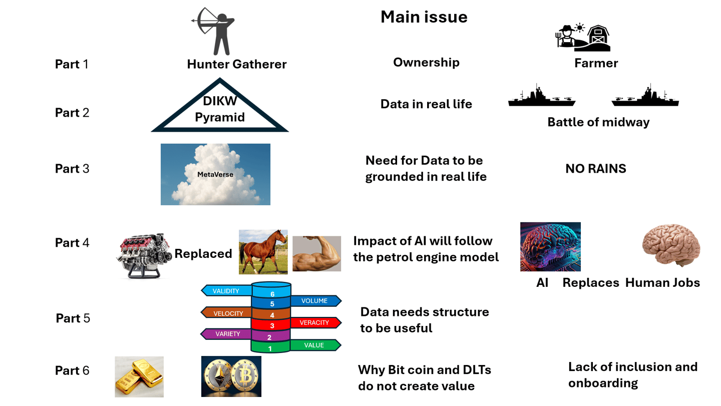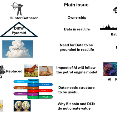 In this series on Virtual Ownership, Part 1 explored how the shift from hunter-gatherers to farmers introduced ownership, shaping societies. Part 2 covered the DIKW pyramid—how data evolves into wisdom. Part 3 examined why the Metaverse failed without real-world grounding. Part 4 compared AI and search to the impact of the petrol engine on human and animal power. And that same model will have an impact of AI on areas where Human Logic and response is used. Part 5 highlighted why big data struggled: without structure, data lacks value in a dynamic world. In this Part 6, we explored why Distributed Ledger Technologies (DLT), once hailed as solutions to many of humanity’s challenges, failed to gain widespread adoption.
