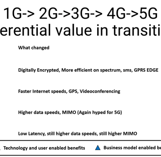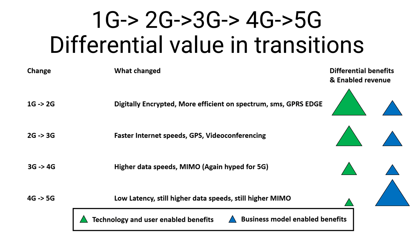 The decline in net sales was 22% net income was 69% in 2016 from the 2009 figures, but just a 2.9% decline in margin. What these figures meant was that the telecom operators did not have a revenue growth when they brough the new 4G equipment and now the three HEN companies short for (Huwawei, Ericsson and Nokia) wanted to sell them the next G equipment which would enhance whatever values they sold and make it great again. I was intrigued and started looking at why the transitions from 1G to 3G went relatively smoothly and the reason was as indicated in the diagram below.
