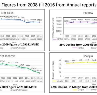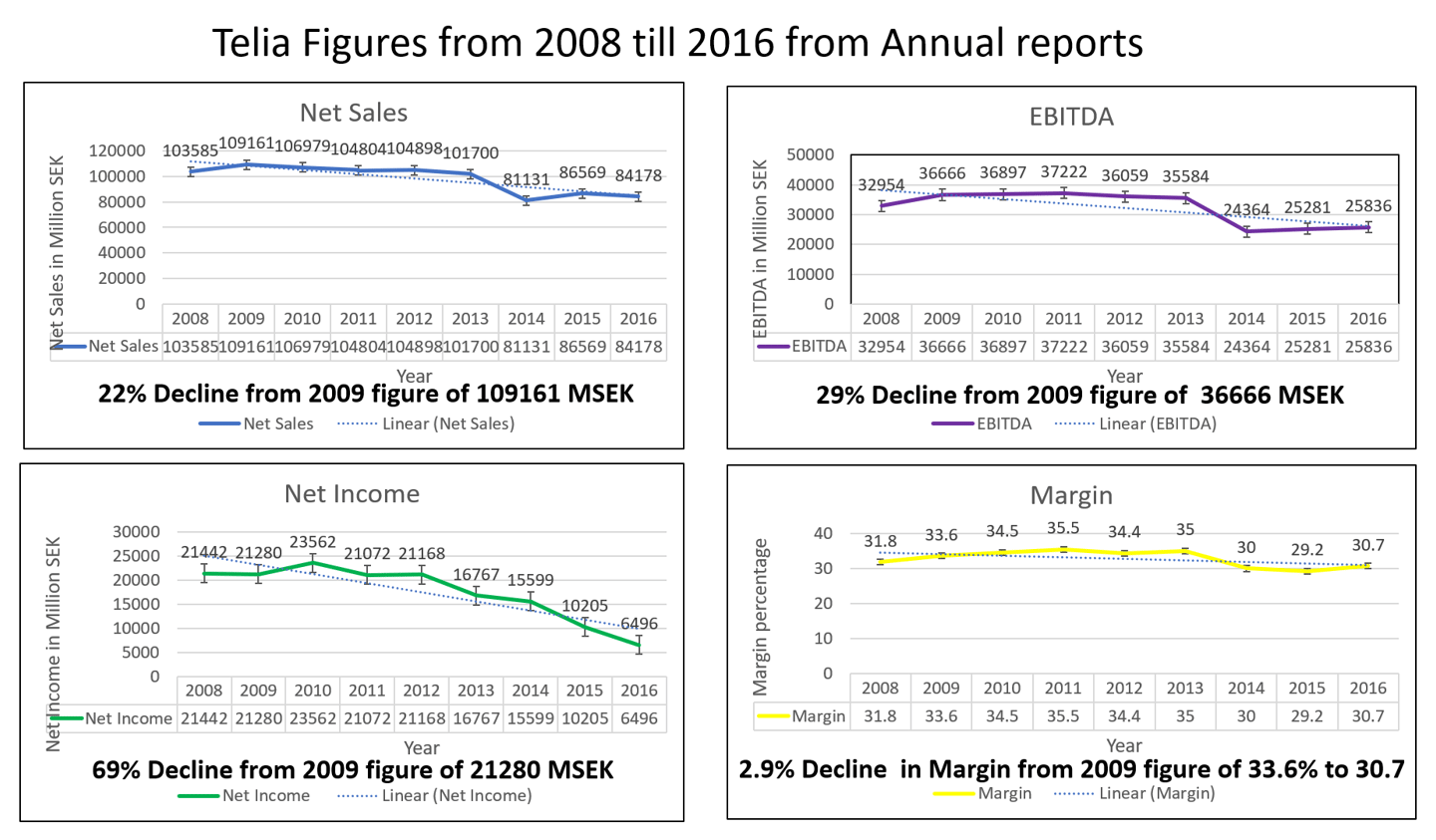 A short history for the above picture is necessary. I had posted a video in 2019 of how the three companies mentioned above would have issues selling their 5G equipment without a VBE model to accompany it. My analysis was based on the VBE model for 5G equipment and the value it brought in for the customers who would buy 5G equipment from the three companies mentioned above. This analysis had started when I had asked a senior executive of Telia Sonera a Swedish Telecom operator (around 2017) on how they evaluated their transition to the next G equipment which was brought to them by Ericsson, Nokia and Huawei. He was in TeliaSonera since 1999 when 1G had started. His answer was we have coffee (called Fika in Sweden) and then we change the equipment to the next generation. And my counter question was that before doing such capital investment do you not evaluate how much revenue the new equipment is going to bring it which will payback the investments you have done. And his answer was there is no such study, the new equipment gets you new capabilities. He had retired from Telia Sonera in 2009 and that is when I started to dig deeper into the revenues of TeliaSonera from 2009 onwards to 2016. What I did was plot the annual reports for Telia Sonera from 2009 to 2016 and the figures shocked me.