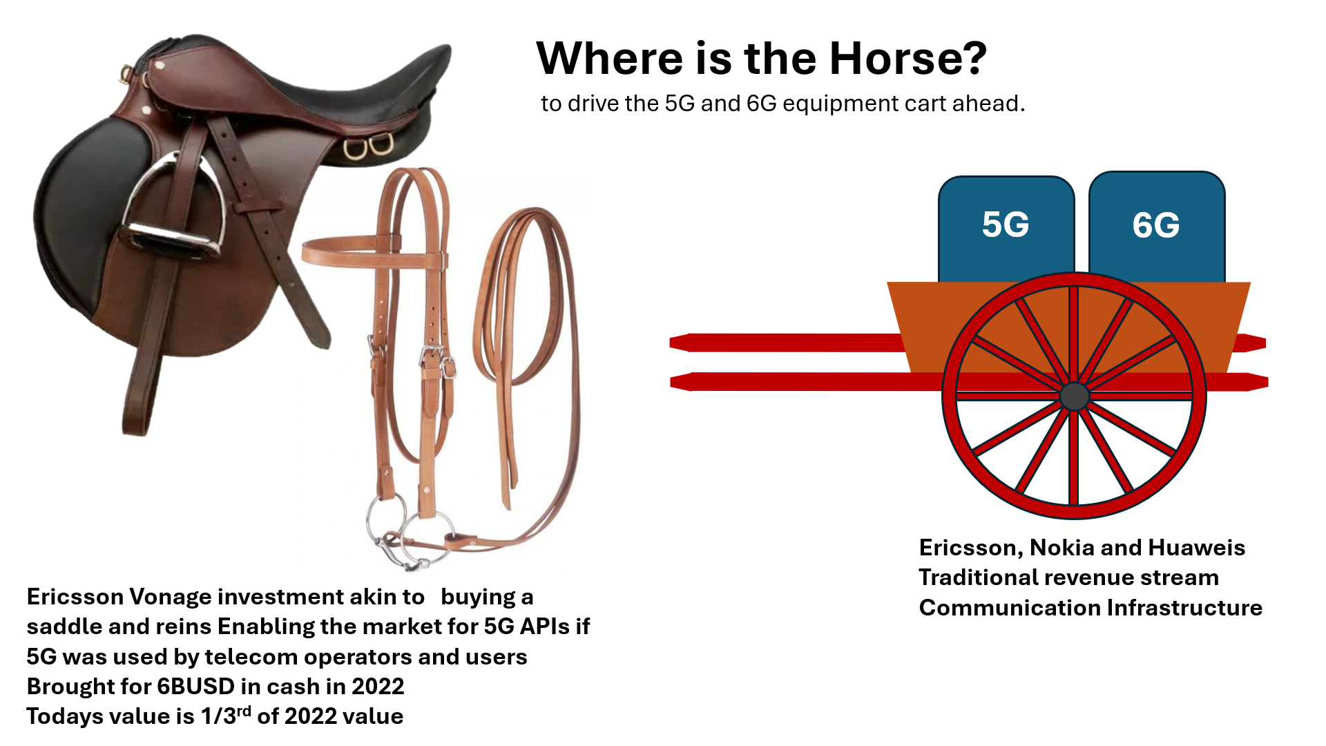 Let me explain the figure above, from 1G to 3G the benefits of replacing the existing equipment was easily monetised and accepted by users. when users went from desktop wired phones to 1G phones, it was a miracle in itself, you could be moving around and be able to take calls and speak from where ever you were. from 1G to 2G the voice calls were clearer and you could also send Short Message Services called SMS. From 2G to 3G you could also have video conferencing and data speeds were higher and you also got GPS and the mobile phone companies enabled these features on the mobile phones. All in all there were many benefits for a user when the telecom operator he brought from transitioned to the next G service. But when 4G came the technology and user enabling benefits were miniscule. With each G transition the benefits decreased and that is where the telecom operators competed among themselves with services offering better data packets etc and that brings us to 2017 when we see the TeliaSonera annual reports. Also globally there were many telecom operators merging as they could not be profitable in the telecom area. In India Vodafone and Idea Mobile merged as they had huge revenue and profitability pressures on them. While the HEN companies were beating the band on the new technologies they were bringing to the market called 5G which would revolutionize mobile telephony offering MIMO and some sales bull#%#" they tried to justify their sales. Imagine this from a telecom operators who like Teliasonera has lost 69% net profitability from its 2009 figures. The pitch was Now "Dear TeliaSonera, replace your existing 4G equipment you brought in 2009 and replace it with the 5G equipment we are going to charge you with." I could clearly see this was a pitch destined for failure and ericsson soon found that out in 2024 when they had to layoff 1200 people in the 5G area. What got me thinking was that with the huge resources at their disposal, they did not think through the VBE model for 5G and in 2022 they brought Vonage for 6.2 BUSD in cash. That for me was akin to the picture I have presented above , buying horse reins and a beautiful leather saddle for a non existent horse. And that too when I could see that 5G could enable huge Business benefits for companies and users alike. But they did not think about the Horse to pull their 5G business forward. It was no wonder when Ericsson had two write offs and in 2024 the value of Vonage came down to 1/3 of the value it was brought for in 2022 of 6.2BUSD in cash (Billion in capital B). While I would agree to the purchase of Vonage when 5G services are being used, buying Vonage in 2022 when 5G enabled services were not there was akin to buying expensive horse reins and a leather saddle for 6.2 Billion USD. It was no wonder there were no questions asked about Vonages VBE model at the Ericsson board. And this was the same story at Nokia and Huawei. Huawei because of their Chinese culture, would give the 5G equipment at a discounted price to the one offered by Nokia and Ericsson where the Social costs are absorbed in the companies pricing.